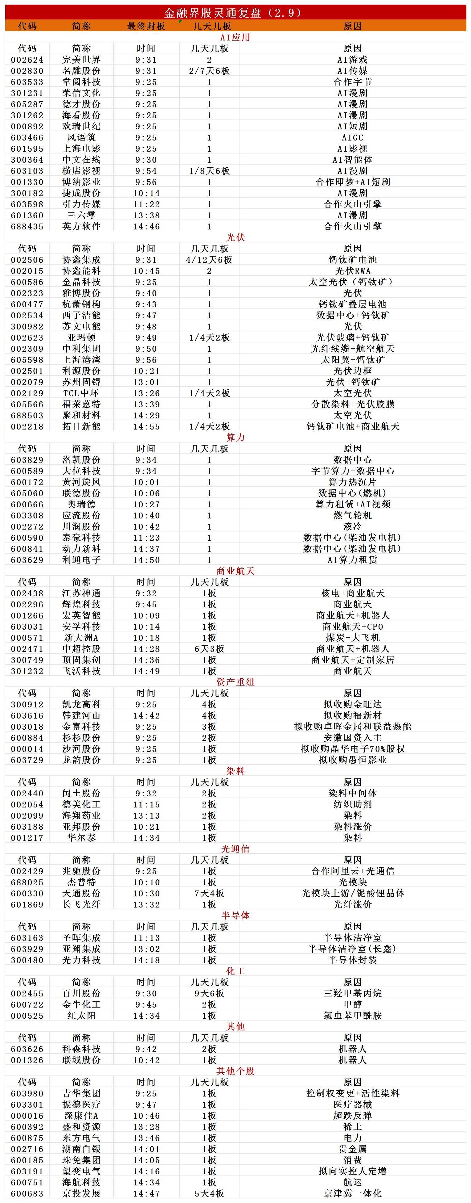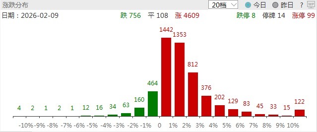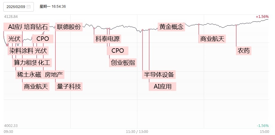 2月9日,市场高开高走,沪指涨超1%,深成指涨超2%。截至收盘,沪指涨1.41%,深成指涨2.17%,创业板指涨2.98%。沪深两市成交额2.25万亿,较上一个交易日放量1038亿。盘面上,市场热点快速轮动,全市场超4600只个股上涨。从板块来看,AI应用端持续拉升,引力传媒、荣信文化、中文在线、海看股份、掌阅科技、欢瑞世纪涨停。化工板块反复活跃,闰土股份2连板,红太阳、华尔泰、海翔药业、亚邦股份涨停。光伏概念表现活跃,协鑫集成4连板,TCL中环4天2板。算力硬件概念集体走强,天孚通信触及20CM涨停创历史新高。商业航天概念走高,中超控股、顶固集创、杭萧钢构涨停。下跌方面,油气股走势较弱,通源石油、潜能恒信震荡下挫。